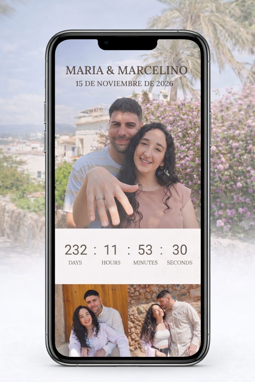 Invitación digital con formulario — Diseño exclusivo adaptado a vuestro estilo, con personalización completa, envíos ilimitados y formulario de control de invitados incluido.