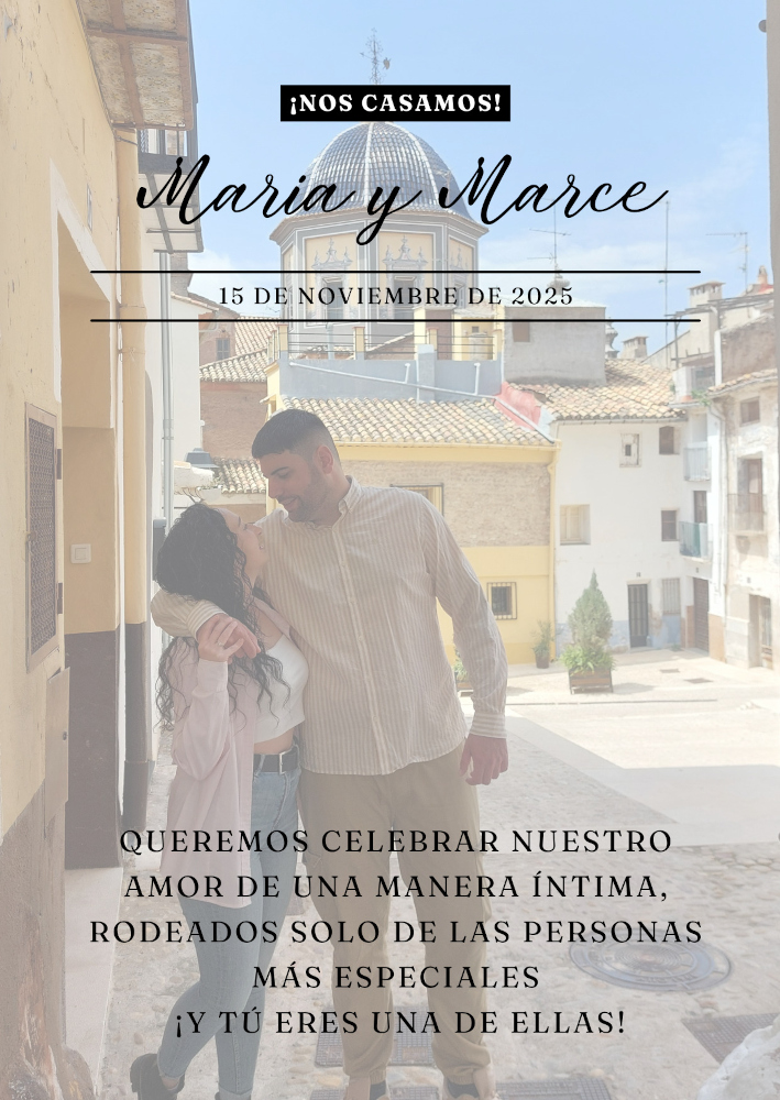 Una imagen muy especial vuestra, preparada para enviar a vuestros invitados y que guarden la fecha de vuestro gran día. Personalizada con vuestros datos, diseñada a vuestro estilo y lista para compartir por WhatsApp, email o redes sociales.